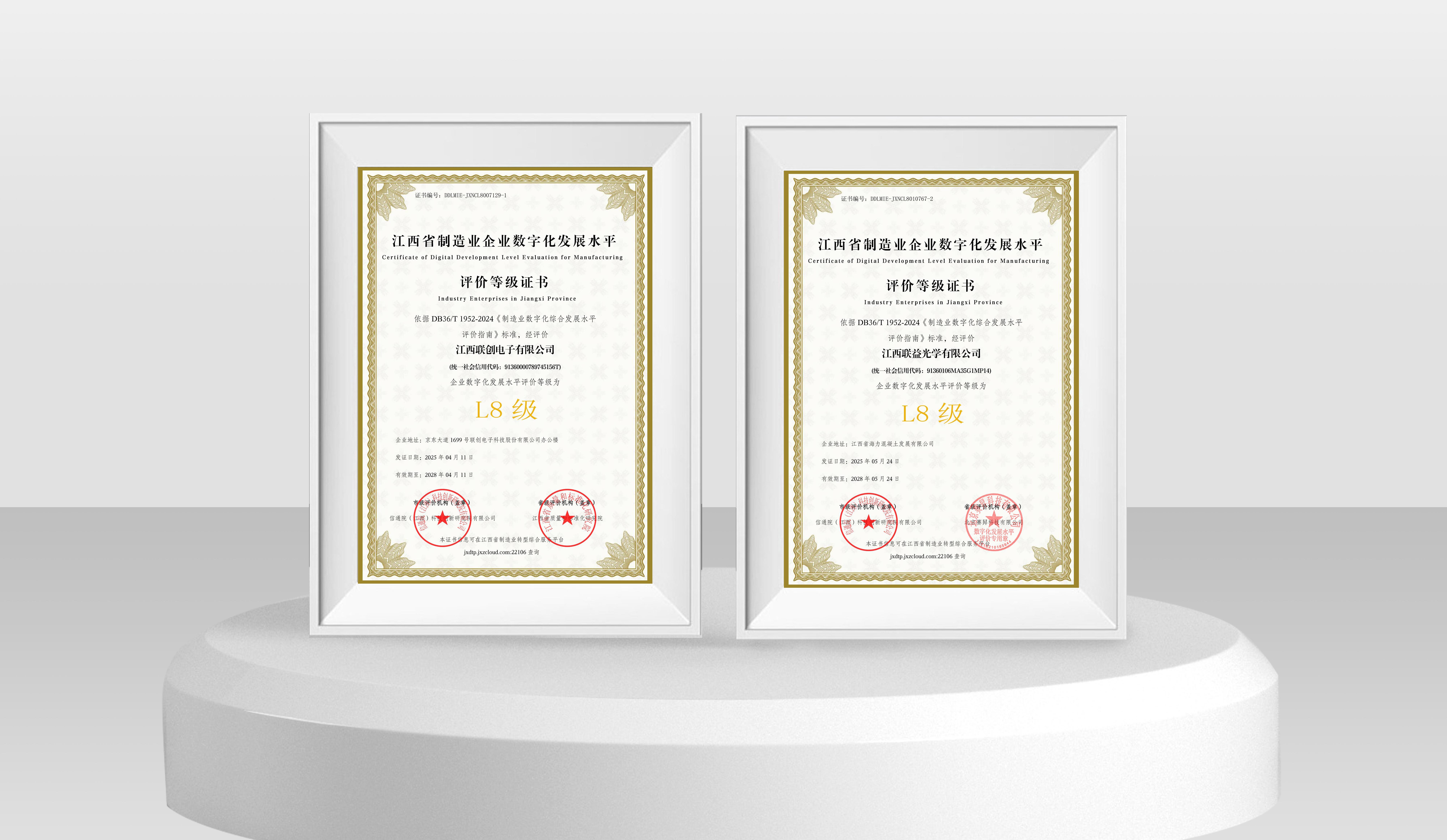近日,联创电子科技股份有限公司旗下LY乐鱼「中国」官方网站,(以下简称江西联创)与江西联益光学有限公司(以下简称江西联益)凭借深度集成与创新应用能力,在江西省制造业企业数字化发展水平等级评价中双双达到L8级水平,标志着两家企业在数字化转型领域已跻身全省“集成提升阶段”最高水平,为全省制造业智能化升级树立新标杆。